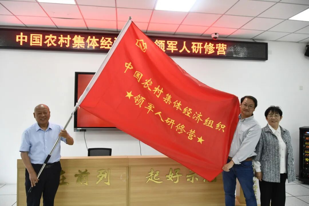 开幕式最后“中国农村集体经济组织领军人研修营”两位主办方代表杨团、赵德余为战旗村党委书记高德敏进行授旗。
